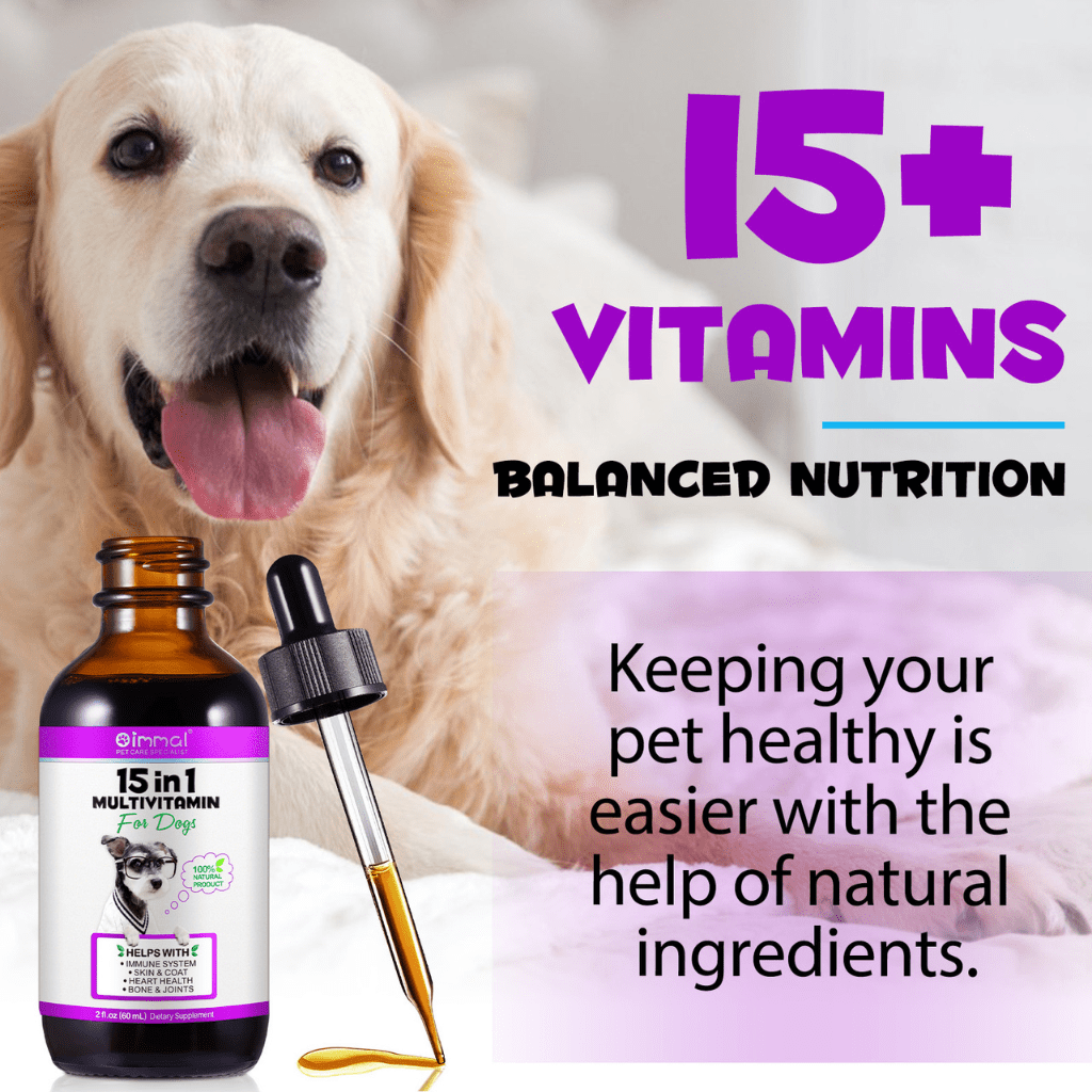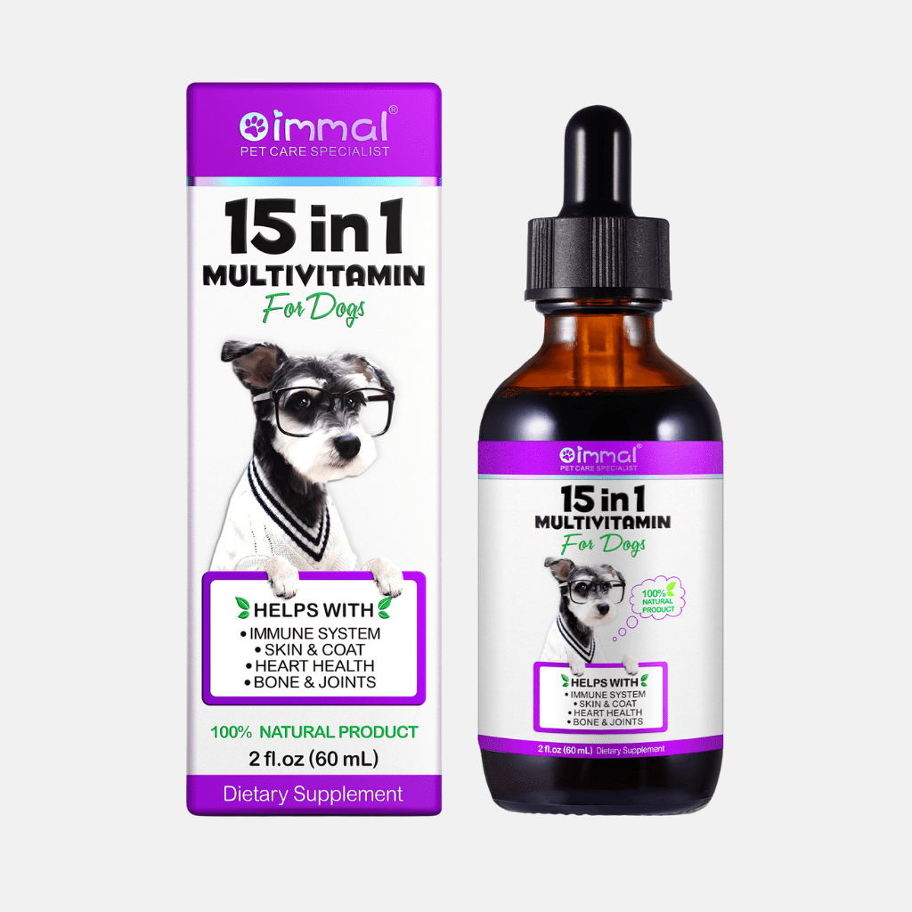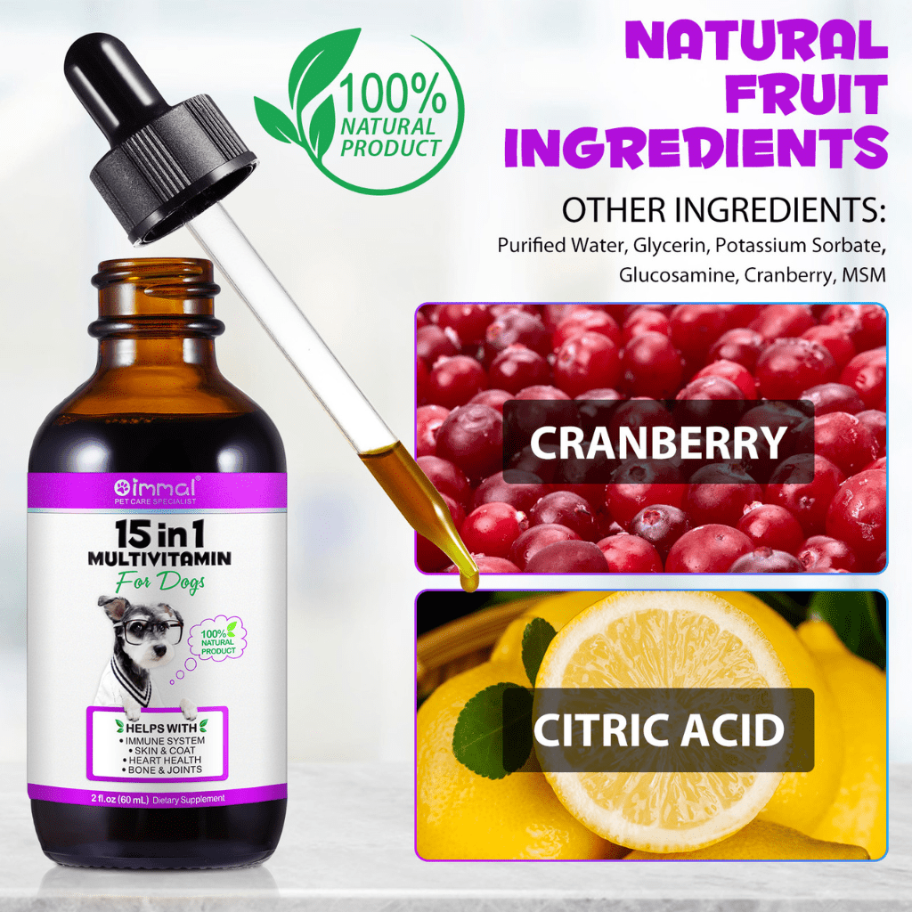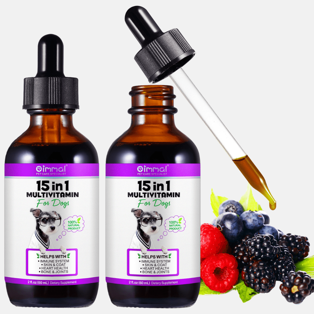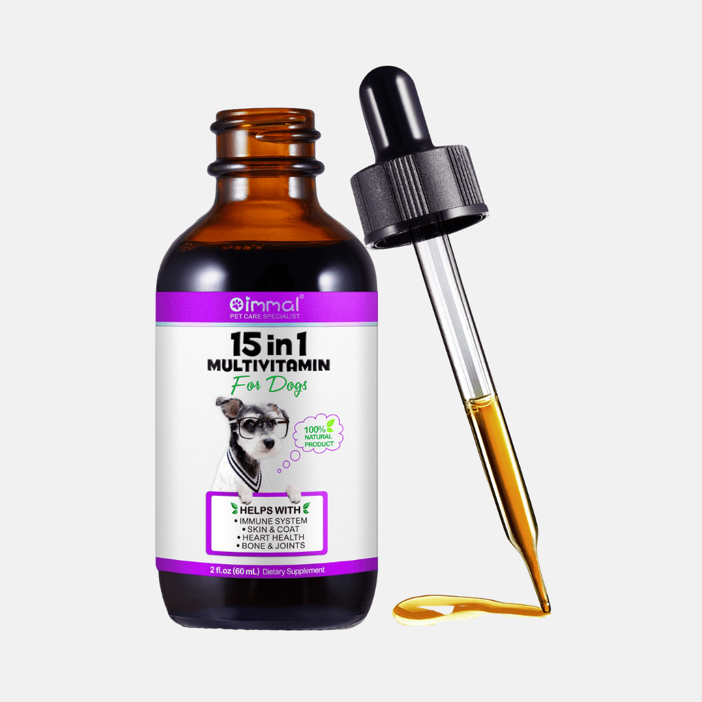 Liquid 15-in-1 dog multivitamin drops with natural ingredients to support immunity, joints, digestion, skin, coat, heart and bones. Easy to mix into food or water.
