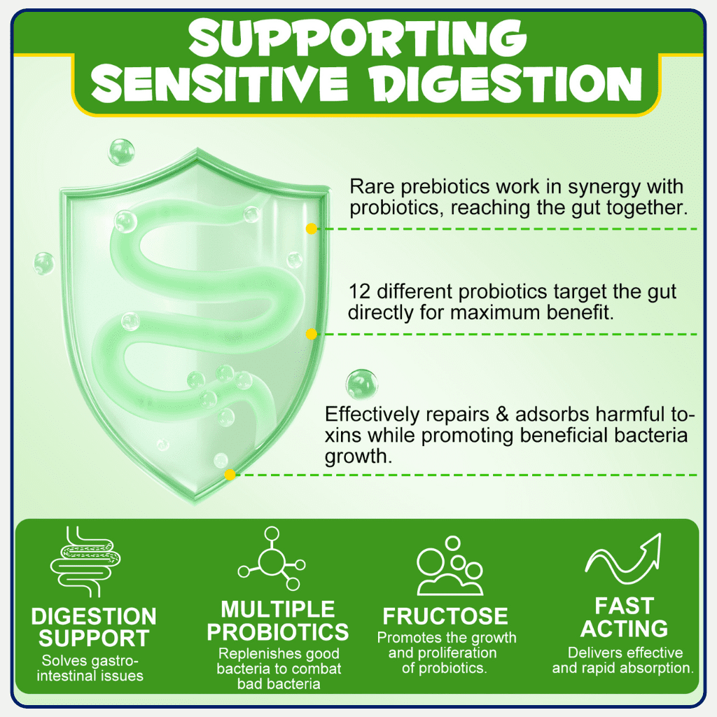- Includes prebiotics (FOS, inulin, acacia) to nourish good bacteria
