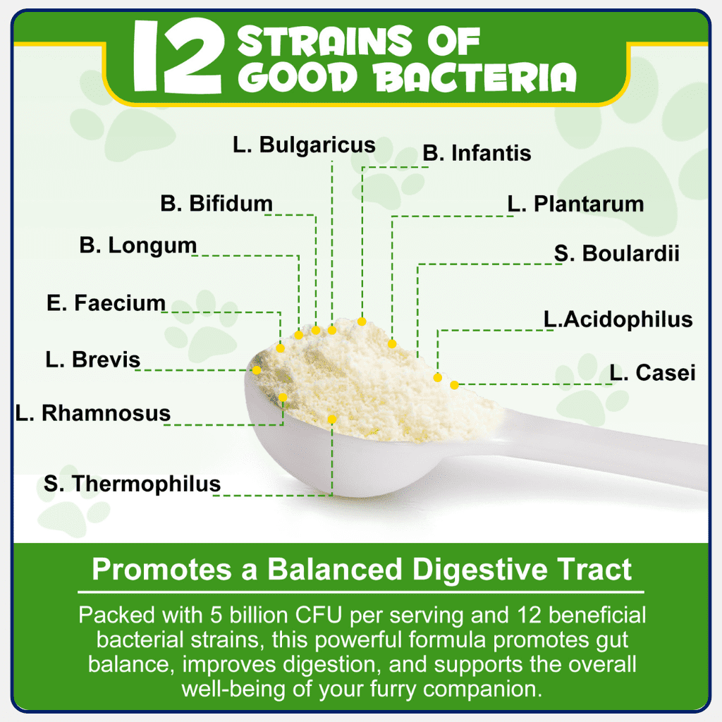 This advanced dog probiotic powder is a veterinarian-formulated blend of prebiotics and probiotics designed to support digestive health, gut balance and immune function. With 12 beneficial bacterial strains and 5 billion CFU per serving, it helps relieve gut discomfort, improve stool quality and promote overall wellbeing. Suitable for daily use and ideal for dogs with sensitive digestion or seasonal allergies.
