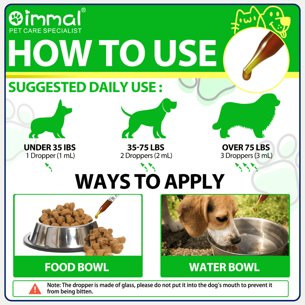 The product comes in liquid drop form with a glass dropper for easy measuring. It can be added to your dog’s food bowl or water bowl as shown in the usage instructions. The liquid format is designed to be easier to feed than pills or capsules.