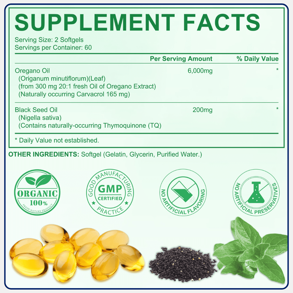 - 6000mg oil of oregano per serving (2 softgels)