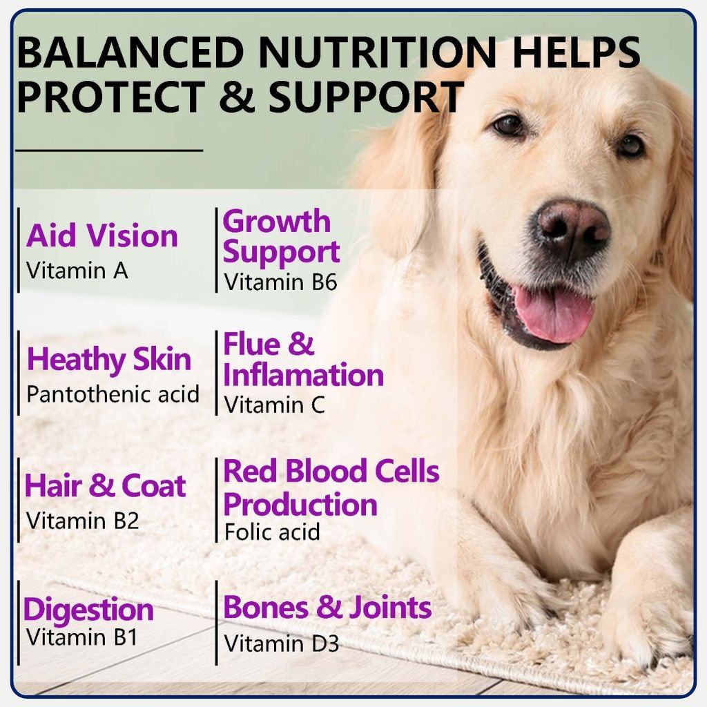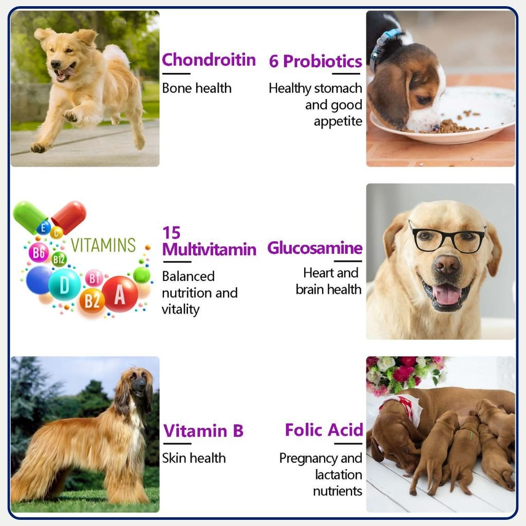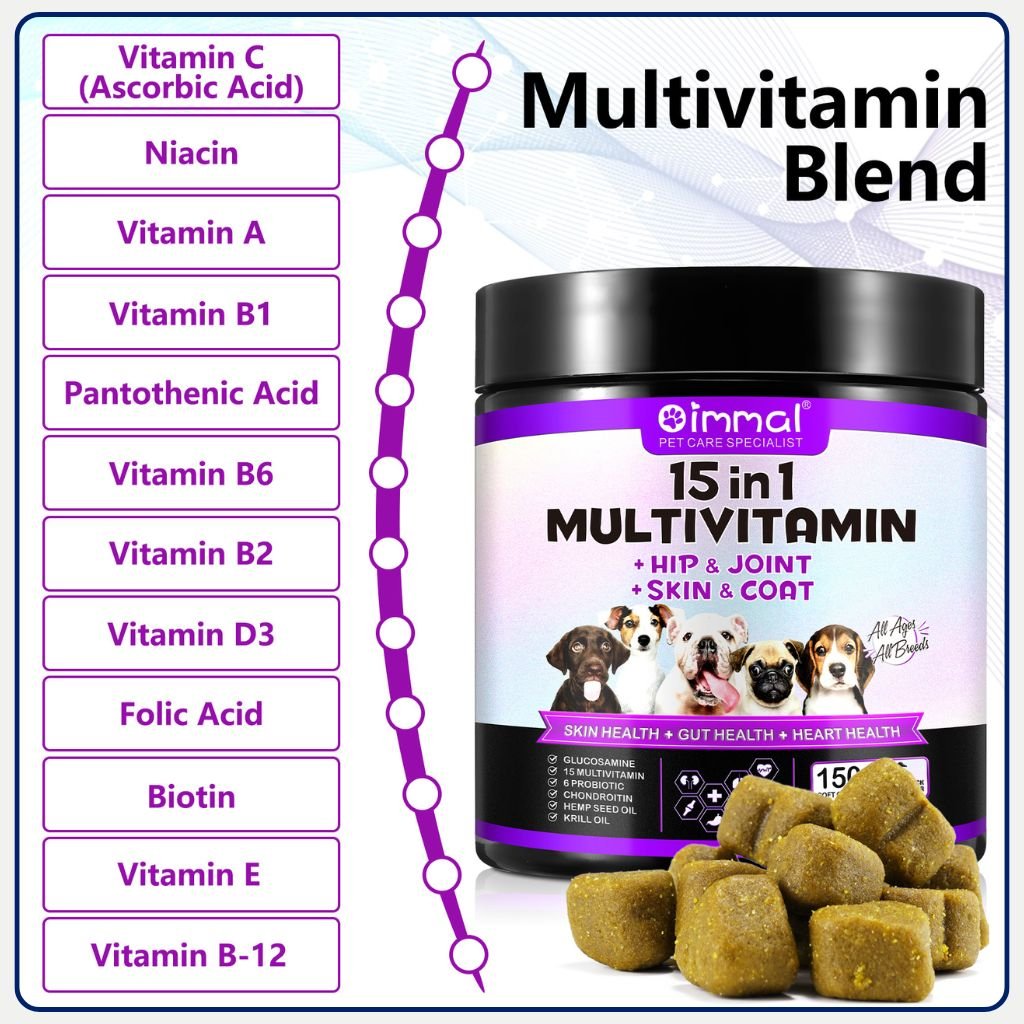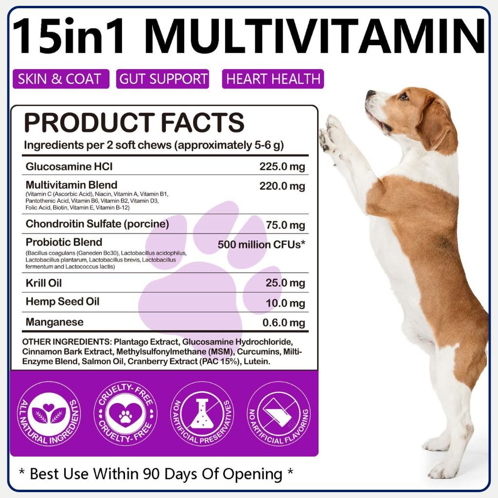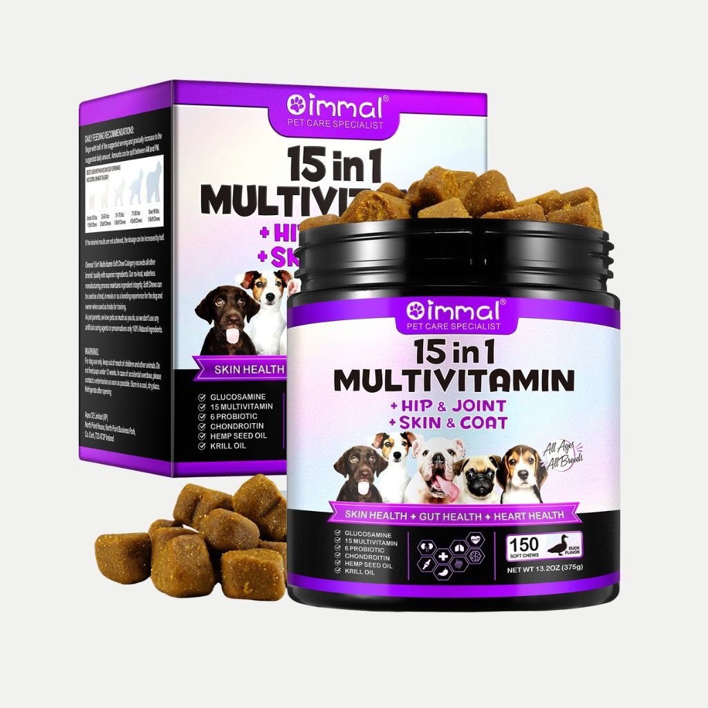 15-in-1 multivitamin dog chews with glucosamine, probiotics and omega oils to support joints, digestion, immunity, skin and coat health for dogs of all ages and breeds.