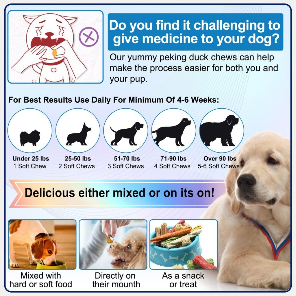 The chews are soft, easy-to-chew treats made with a Peking duck flavour, making them appealing even to fussy dogs. They come in a soft chew format that can be given directly, mixed with food, or used as a treat. This makes daily feeding simple and stress-free.